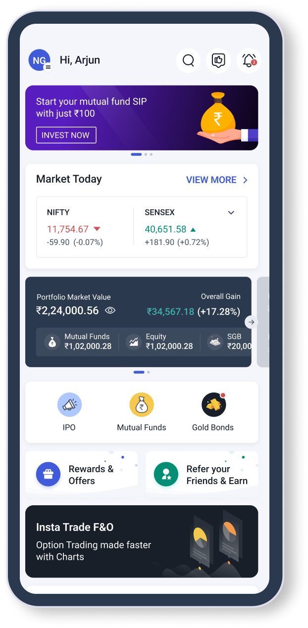 • Convenience: Users can now trade for different investment options such as shares, stocks, index and gold, bonds, Government securities, initial public offerings(IPOs), Exchange traded funds (ETFs), non-convertible debentures(NCDs), mutual funds, etc which are traded on Indian exchanges (BSE/NSE) via a single Demat account with zero paperwork.